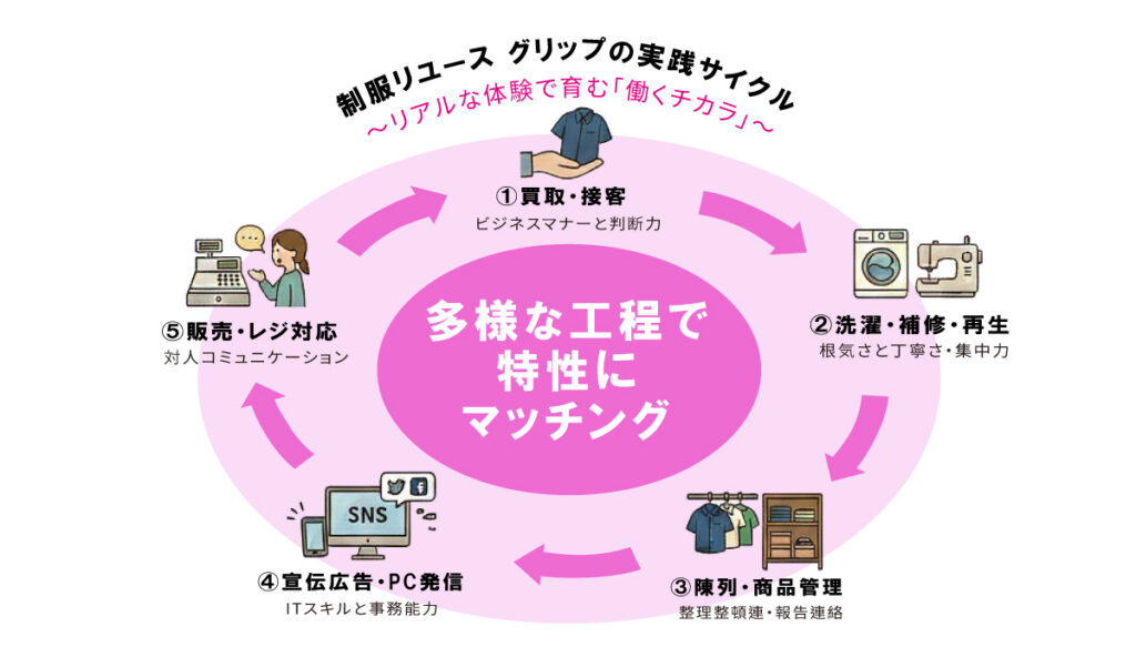 グリップは「制服リユースグリップ」を核事業とし、地元企業様からも多様な作業を受注しています。IPSモデルを採用することで、仕事をしたいと思うすべての人を対象にした就業支援を実施しています。リアルな職場体験で、必要なスキルを身に着け、就職につなぎます。制服リユースグリップを核事業とし、地元企業様から受注したPC作業、軽作業等で作業のバリエーションを補完しながら、得意を活かし、苦手をカバー。多様な作業に取り組んでいます。